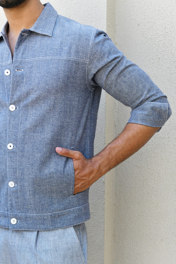Woven on hand-operated looms, this cotton fabric strikes the perfect balance between breathability and durability—making it well-suited for outerwear. The resulting jacket feels both airy and substantial, ideal for transitional weather or layering across seasons. The fabric lends character and movement, elevating the silhouette without overwhelming it.